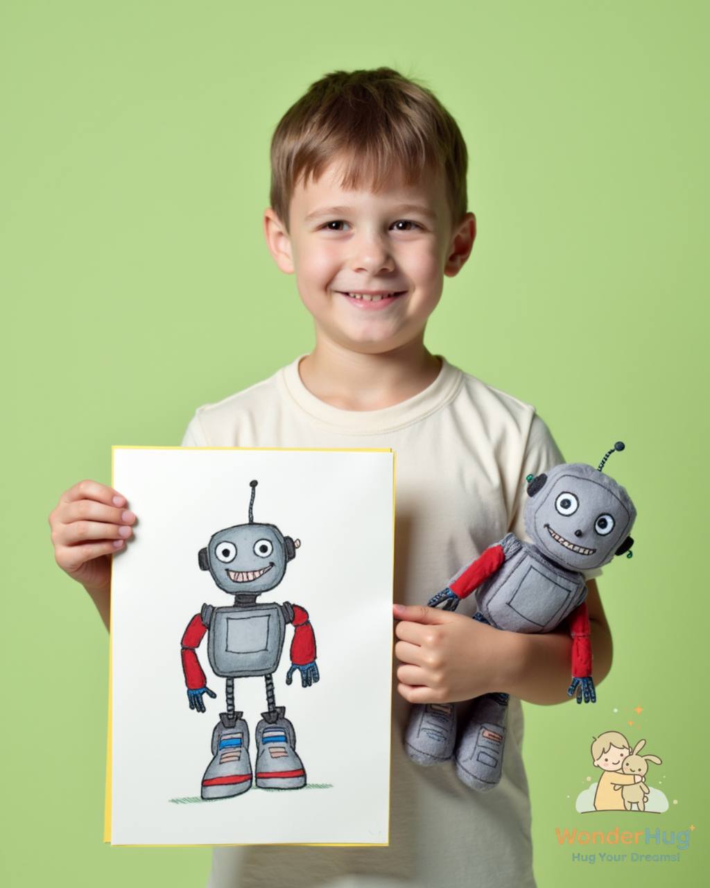 Çocuğunuzun hayal gücünü yumuşacık bir gerçeğe dönüştürün! WonderHug olarak, çocuğunuzun yaptığı orijinal çizimlerden tamamen kişiye özel peluş oyuncaklar tasarlıyoruz. İster bir süper kahraman, ister sihirli bir yaratık ya da çok sevdiği bir evcil hayvan olsun, onların hayal arkadaşlarını sevgi ve özenle gerçeğe dönüştürüyoruz.